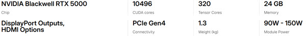 10,496 個の CUDA コアと 320 個の第 5 世代 Tensor コアを搭載した NVIDIA の Blackwell RTX 5000 組み込み GPU で、堅牢な AI 処理を再定義します。24 GB GDDR7 ECC メモリは最大 896 GB/秒の帯域幅を実現します。これは前世代より 55% 高速で、より大きなデータ セットを GPU に送り、リアルタイム処理を可能にします。SOSA 準拠 (14.6.11/13) で、SOSA 準拠の Ada/Ampere システムと下位互換性があるこの 3U モジュールは、最も要求の厳しいアプリケーションで必要な大規模なデータ セット処理を処理できます。